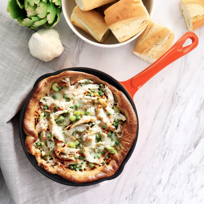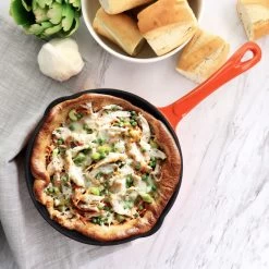 The MegaChef enameled round 8in pre-seasoned cast iron pan is an every day essential for your cooking needs. Small 8in size is great for one to two person meals, side dish prep, reheating, and more. Enameled handle and outer coating adds a pop of color and a smooth handling surface. Versatile cast iron material is great for consistent even heating, and bringing your dish from the stove top to finish in the oven- oven safe up to 500F. Features include a hanging hole on handle that offers storage options, and pour spouts at the sides that are convenient for draining meat juices and pouring sauces. Preseasoned coating prevents rust while sitting in storage and means you can get to cooking right away! Item Dimensions: 14.20″ x 8.50″ x 1.60″ Item Weight: 3.05lbs