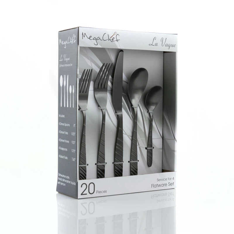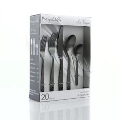The MegaChef La Vague 20-piece Flatware Set is made of high quality food grade stainless steel, the quality material in high standard resists corrosion and rust, ensures long-lasting use. The La Vague Silverware Set is smoothly finished with no sharp edges, safe and comfortable for both adults and children. Each piece in this Utensil Set is versatile and perfectly weighted and balanced to feel comfortable in your patrons hands. With its proper sizes this set can fit perfectly with your other dinnerware or tableware sets. Item Dimensions: 9.00″ x 7.00″ x 2.00″ Item Weight: 3.00lbs