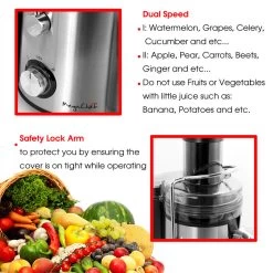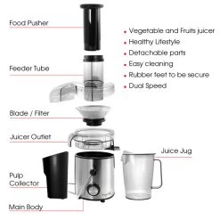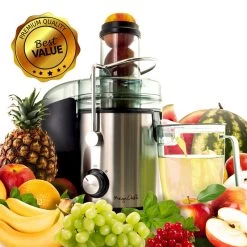 The MegaChef Juice extractor juicer machine is the must have juicer in every household. This powerful Juice Maker will get extract powerful nutritions, vitamins, and minerals from the fruits and the vegetables. With a 800W powerful motor, juicing has never been so easy. The juicer has dual-Speed Modes: “I” low speed for soft and juicy fruits and vegetables like watermelon, orange, grape, celery, cucumber. “II” high speed for hard fruits like apple, pear, carrot, beets, ginger and kale. This machine is very easy to clean. The juicer is equipped with 3.5 cup juice jug and 4 cup pulp collection, it allows you to extract juice from mixture of fruits and vegetables in one serving. All removable parts of juicer are dishwasher safe, the juicer come with a cleaning brush to clean any residue from juicing Safety Locking Arm is to protect you by ensuring the cover is on tight while operating. Item Dimensions: 17.00″ x 16.00″ x 7.00″ Item Weight: 7.43lbs