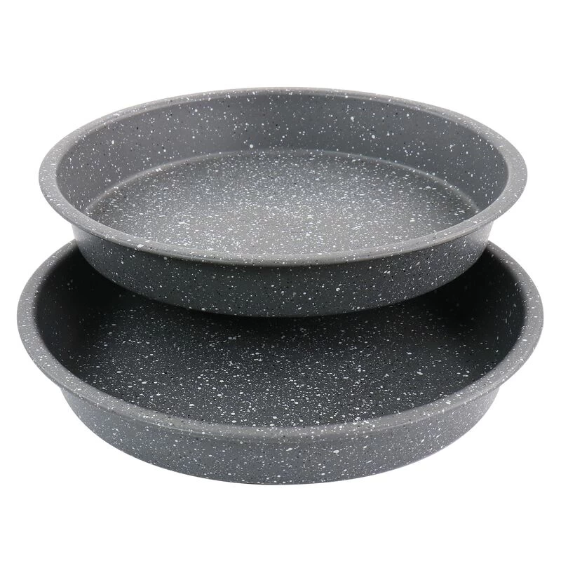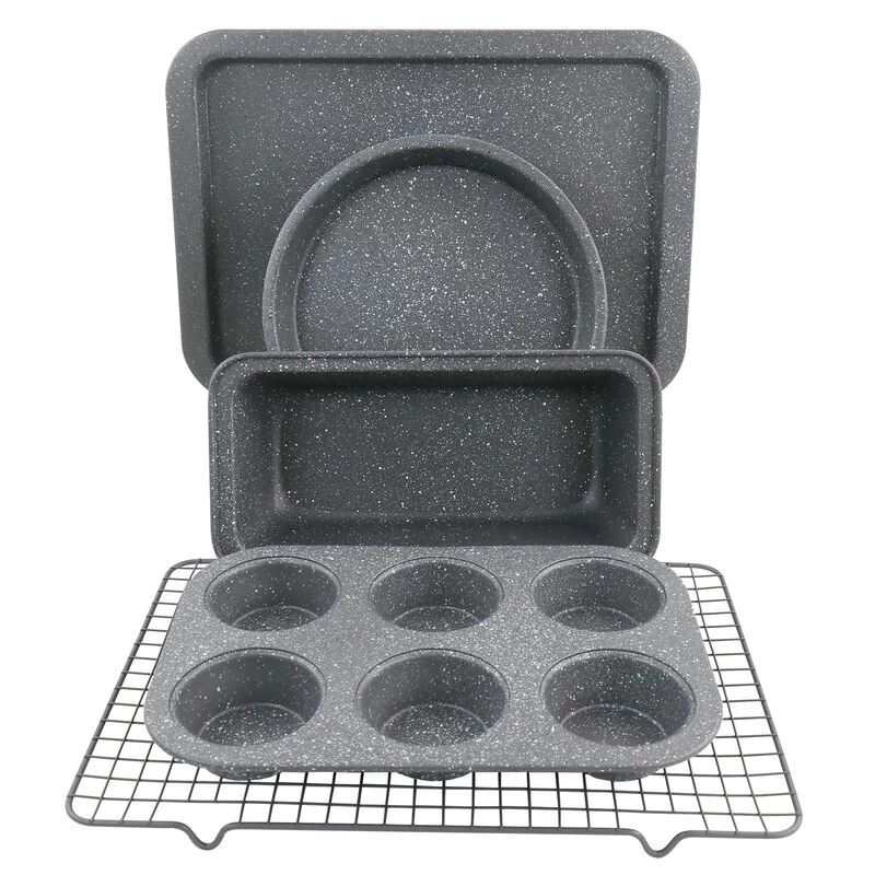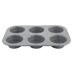 Bake up all your favorite baked goods with the Oster 6 piece bakeware set. Made of strong and durable carbon steel that is built to last. The beautiful greystone texture gives it the classic kitchen feel. Comes complete with 2 round cake pans, 1 six cup muffin pan, 1 loaf pan, one cookie sheet, and one cooling rack. The non stick feature makes it very easy to bake with easy food release technology. Treat all your guests with all the delicious treats. Item Dimensions: 15.00″ x 10.75″ x 3.50″ Item Weight: 3.10lbs