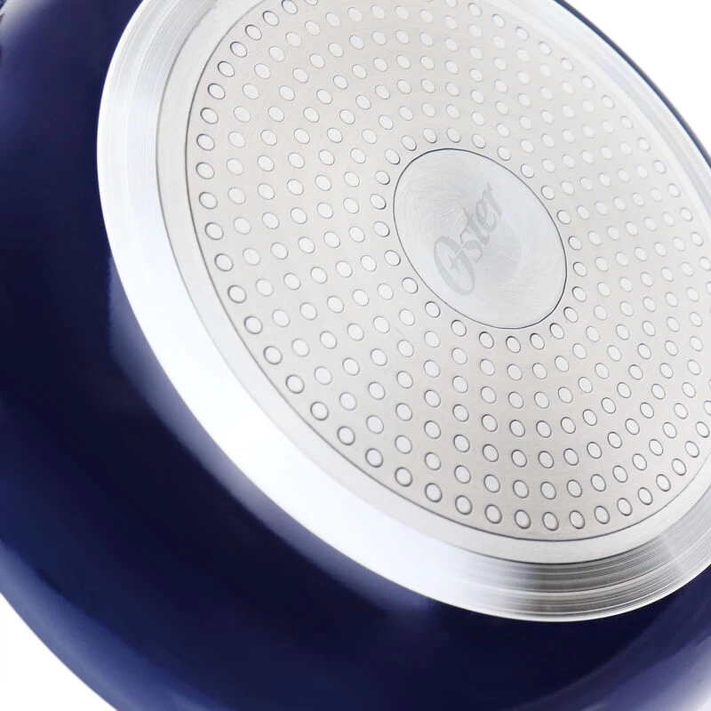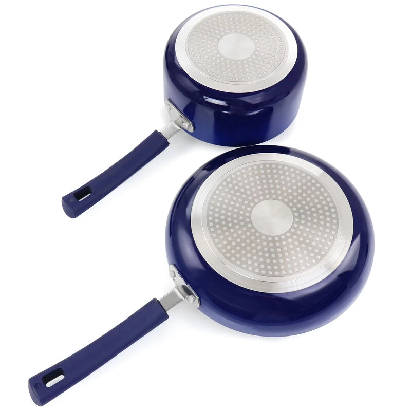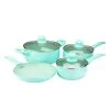 This seven piece cookware set comes with all your necessary every day essential pieces. Set includes one dutch oven with lid, one sauce pan with lid, one frying pan, one slotted turner, and one solid spoon. Each cookware item features a nonstick interior coating for low-fat cooking and easy clean up. Vented, tempered glass lids allow you to monitor cooking progress along the way and release pressure and steam build up. The Bakelite handles and knobs are ergonomic for a comfortable grip and cool to the touch even while cooking. These pieces are compatible with gas, halogen, electric, and vitroceramic cook tops. Item Dimensions: 5.25″ x 21.50″ x 13.00″ Item Weight: 8.20lbs