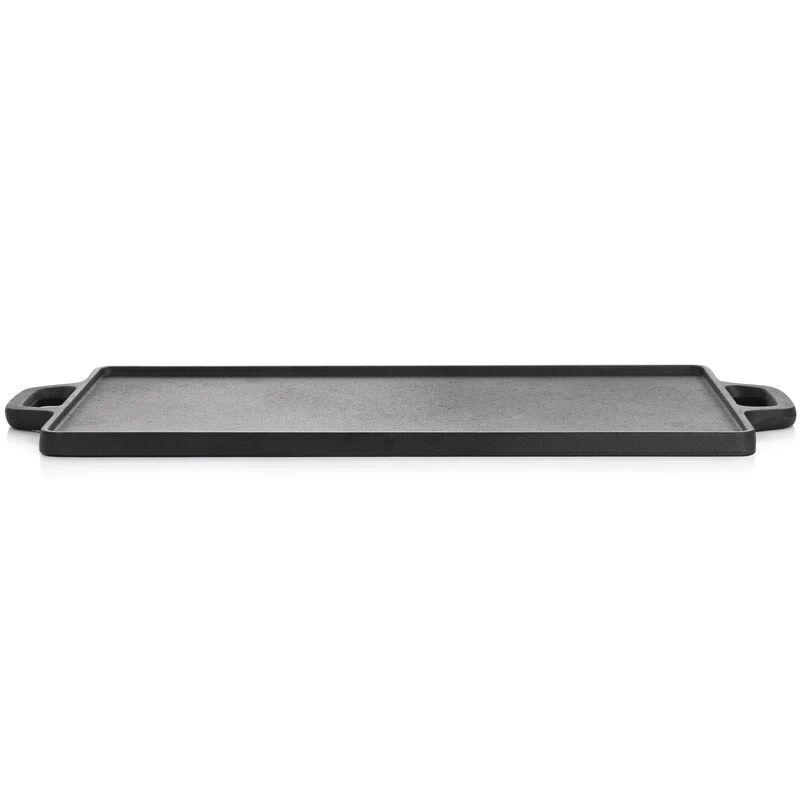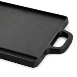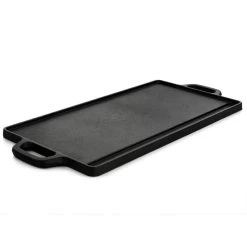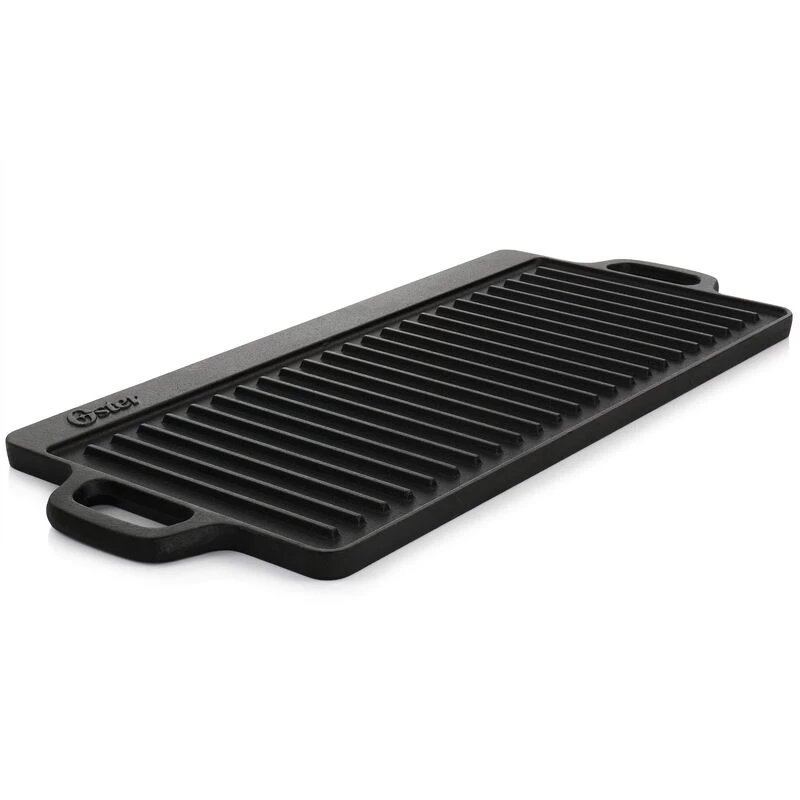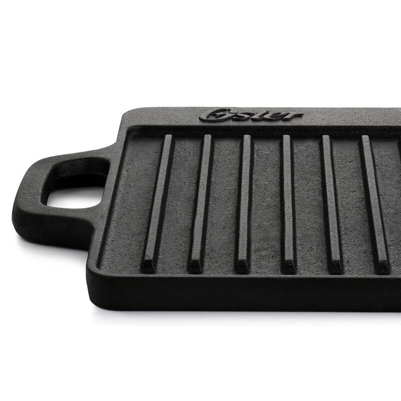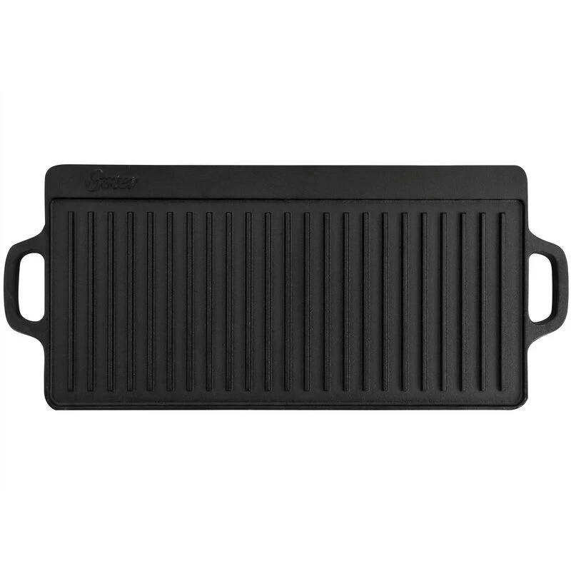 The Oster Castaway pre-seasoned cast iron reversible griddle is the multi-functional cookware piece that every kitchen needs. The long 18in x 9in construction is perfect for cooking family sized batches of your favorite breakfast foods, burgers, bbq, and more. Bring the restaurant quality food into your home with this piece. Cast iron construction is pre-seasoned with vegetable oil for immediate use, and distributed and retains heat evenly for consistency. Compatible with gas, electric, vitroceramic, induction, and oven safe. Item Dimensions: 9.20″ x 12.20″ x 0.60″ Item Weight: 9.90lbs