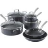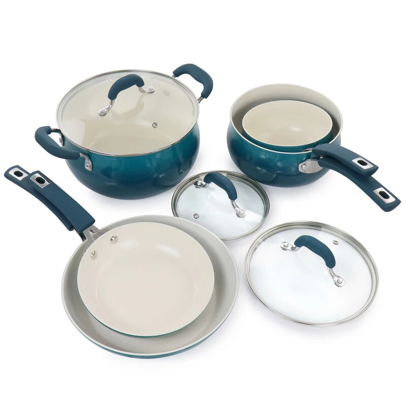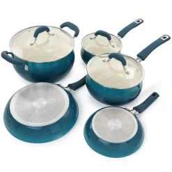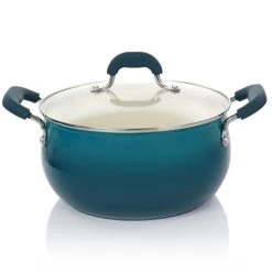 Liven up the kitchen space with the Oster Corbett 8 Piece Nonstick Aluminum Cookware Set in Teal. This charming belly shaped cooking set allows for well distributed heating while providing a large carrying capacity. Soft grip handles stay cool to the touch as they give you a comfortable hold. Cut down on oils and fats, thanks to the ceramic nonstick interior. For long lasting care, hand wash the cookware and avoid using abrasive tools. Create soups, curries, stews or any other warm comforts for the family to enjoy. Item Dimensions: 20.00″ x 12.60″ x 7.80″ Item Weight: 12.40lbs