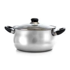 Oster Rametto Stainless Steel 8 pc Cookware Set features convenient larger sizes, belly shaped designed Sauce Pans, Saute Pan and Dutch Oven. Each piece comes with a tempered glass lid that includes a steam vent for overflow protection. Glass lids are great for checking on your food without releasing heat for even and precise cooking. Cookware has black ergonomic bakelite handles and knobs for safe handling, smaller pieces have a convenient hanging hole/utensil holder. Long lasting 0.5mm mirror polished interior and semi polish exterior stainless steel set. Item Dimensions: 22.20″ x 13.00″ x 15.50″ Item Weight: 12.00lbs