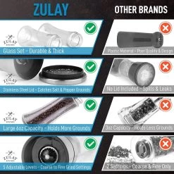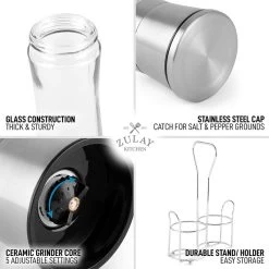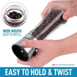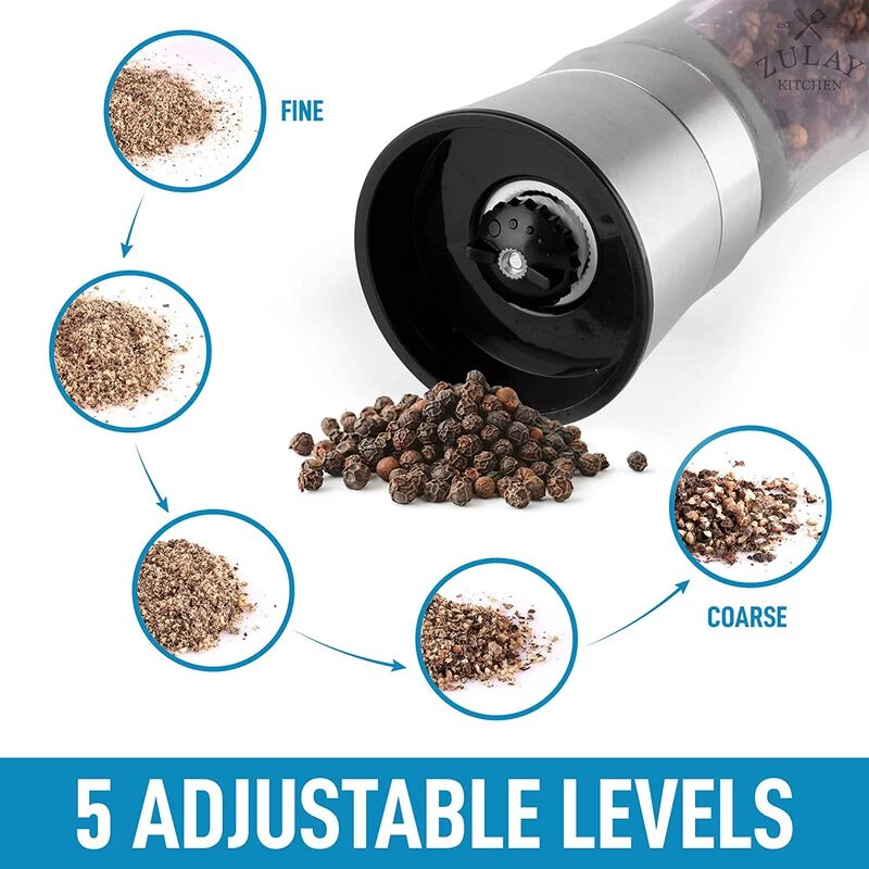 Adjustable Grind Mechanism: Designed with a ceramic grinder that operates an adjustable knob of 5 grinding levels optimizable from fine to coarse grind. Great for commercial and home use. Mess-Free Operation: The grinding mechanism is located at the top of the grinder, ideal for reducing the mess from pepper or salt dust as you tip the bottle upside down when grinding. Designed with a wide mouth and easy-to-twist top that makes refilling effortless and mess-free. Large capacity does not need refilling often. Preserve The Freshness Of Your Spices: Give your dish a crisp and elevated spicy pepper taste from freshly ground peppercorn smartly stored to be impervious to dust and moisture when stored. No Hassle, Zulay Guarantee: We back our products with a lifetime warranty.