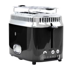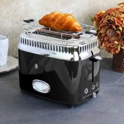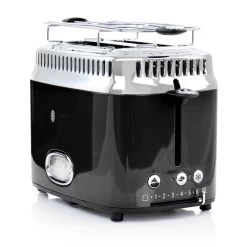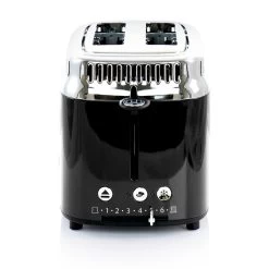 Classic retro-styling meets modern innovation for premium toasting performance. This 2-slice toaster features a countdown timer that shows precisely how much time remains on the toasting cycle. The variable browning control ranges from 1 (light) to 6 (dark) to satisfy all preferences. Choose the Bagel function for a perfectly toasted cut side with a warmed bottom side or the Frozen setting for fresh-like results. This toaster comes with a removable warming rack that quickly heats buns, pastries, and rolls. Plus, the removable crumb tray ensures easy cleanup. Item Dimensions: 6.70″ x 9.80″ x 7.90″ Item Weight: 3.70lbs