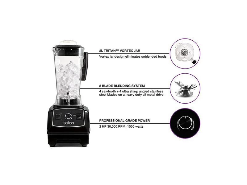 The perfect blend of Power and Affordability. Powered by a 1500W, 2HP motor that produces 30,000 rpms, and includes an 8 blade blending system that will blend, crush, emulsify, chop, puree, liquefy whole fruits and vegetables, ice, frozen fruits and nuts. Start your morning off with a smoothie, prepare hummus for a snack and a hot soup for dinner. No matter what you throw into to the 2L Vortex Jar, the Salton Power Blender will handle it easily