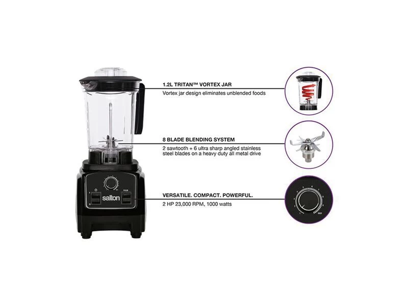 The Salton Compact Power Blender has a Vortex Jar with 8 stainless steel, Japanese blades and a 2HP, 23,000RPM, 1000 watt motor. With its powerful motor and innovative design it can blend, emulsify, chop, puree, crush and even make a hot soup! It also comes with a recipe book loaded with delicious, Never leave your smoothie behind.