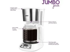 The Jumbo Java brews 14 cups of coffee. With a 24 hour programmable timer, you can start each morning with a cup of fresh coffee. The keep warm function keeps your coffee at the ideal temperature and switches off automatically after 2 hours. With its attractive design and stainless steel accents, this coffee maker is the perfect addition for the home (or office) of coffee lovers.