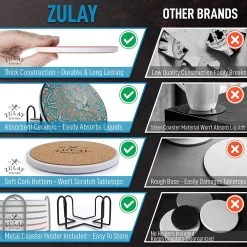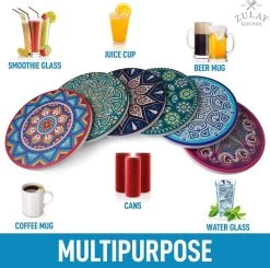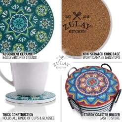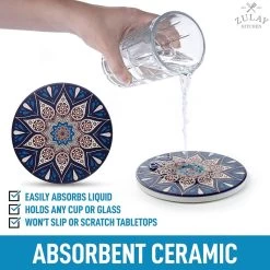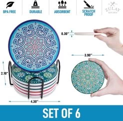 Mandala Design Coasters: Zulay ceramic coasters for drinks look more like art than just your regular coasters. Effectively prevent moisture from seeping into your furniture without compromising your interior design. The set includes 6 round mandala-style ceramic coasters that look stunning and vibrant, making you want to use them all the time.