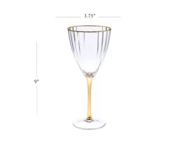 Gilded with a fine gold design as its border and stem, this glassware set is useful for festive occasions and posh events. Its unique evolving cup is appreciated by those with a finer taste for modern sculpts. Additionally, this set washes and stores beautifully