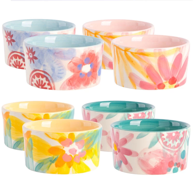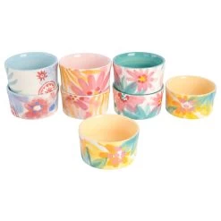 Add a playful and colorful twist to your home bakes with the Goji Blossom 8 piece ramekin set. With 8 ramekins in four individual floral designs, this set will help you to step up your serving and single serve bakes to the next level! Each ramkekin has a water color floral design on outer and solid interior in different colors. This oven safe bakeware set if perfect for serving individual desserts to your guests, putting out appetizers, and the perfect solution for when you want a treat just for you! Prep both savory and sweet dishes with this set. Item Dimensions: 7.00″ x 6.00″ x 4.00″ Item Weight: 3.00lbs
