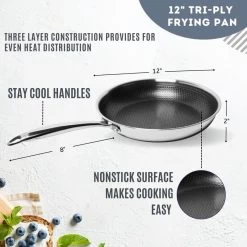 Supply your kitchen with the essentials for your every day kitchen needs, especially for newlyweds or new chef enthusiasts. Tri-ply cookware, often known as three-ply cookware, is made up of different layers of metals that are bonded together. 3 Layers: Layer 1 stainless steel, Layer 2 aluminum, Layer 3 stainless steel. An anodizing process is applied on the surface making it PFOA free. Season this frying pan with 1 teaspoon of oil before cooking.