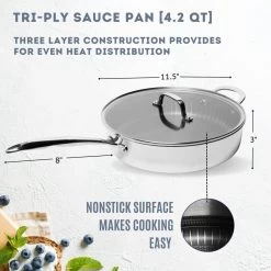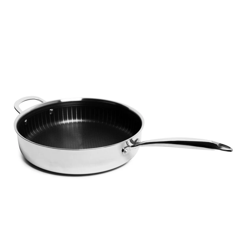 Supply your kitchen with the essentials for your every day kitchen needs, especially for newlyweds or new chef enthusiasts. Tri-ply cookware, often known as three-ply cookware, is made up of different layers of metals that are bonded together. 3 Layers: Layer 1 stainless steel, Layer 2 aluminum, Layer 3 stainless steel. An anodizing process is applied on the surface making it PFOA free. Season this frying pan with 1 teaspoon of oil before cooking.