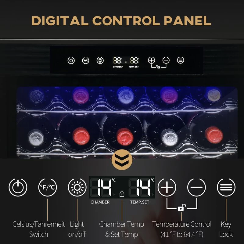 - – EFFICIENT WINE STORAGE: This wine coolers fridge uses quality compressors to effectively provide fast, strong, and stable cooling. It has an adjustable temperature range from 41 °F to 64.4 °F.